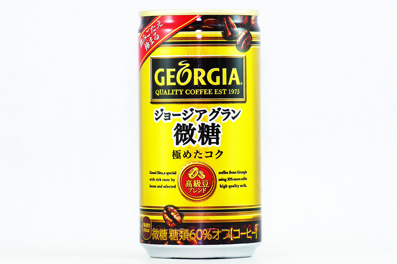 | 飲みごたえ極まる QUALITY COFFEE EST 1975 極めたコク Grand Bite, a special coffee from Georgia with rich taste by using 30% more coffee beans selected high quality milk. 高級豆ブレンド 微糖 糖類60%オフ【コーヒー】 1本当り 41kcal 通常よりも+30%※のコーヒー豆を贅沢に使用した深く、飲みごたえのあるコーヒーの味わい。 ジョージア 検索 ※公正競争規約 コーヒー規格下限基準値(5g/100g)比 軽く振り、少し待ってから、あけてください 国産 アルミ あき缶はリサイクル コーヒー飲料等通常品(7.5g/100ml)に比べ糖類60%減 |
