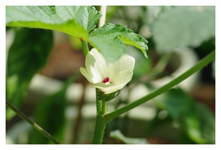 丸オクラがついに開花~!、ちなみに今回はエメラルドの方です。さすが南国の植物といった派手さで、ちょっと野菜のお花には見えない感じがします。