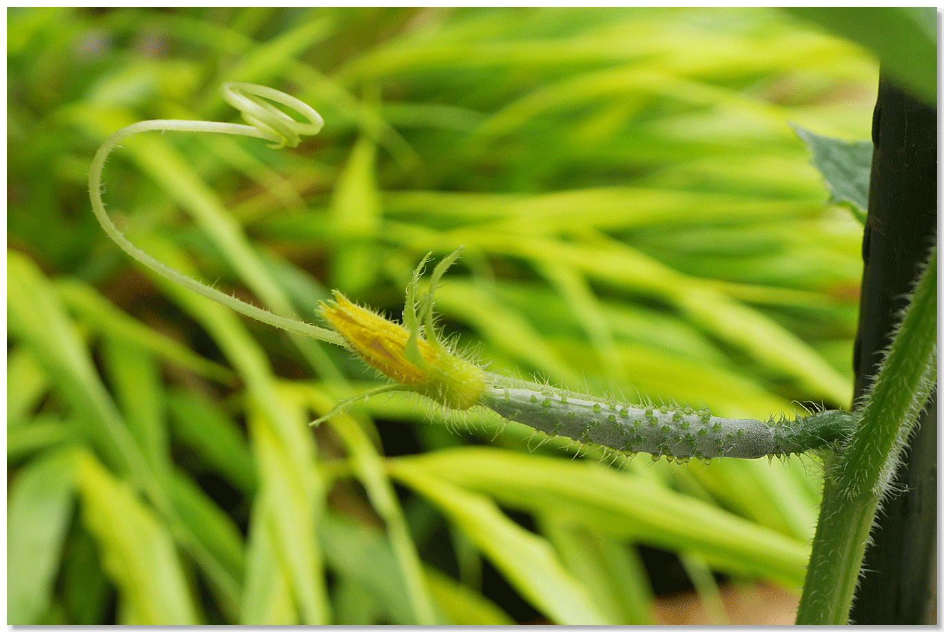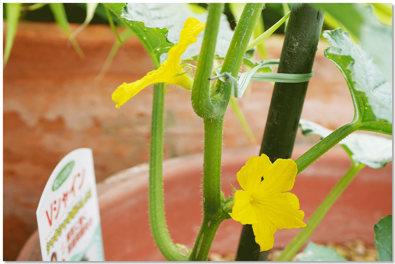 キュウリは自ら支柱に巻き付いてくれるので手間いらずですね^^。