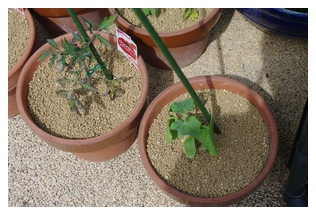 トマトとキュウリ、お昼近くの様子です。う~ん、これでもここ数日朝夕共にお水をあげているんですけどな~・・・。ま~、少ないながらも今までの経験から言って、トマトは乾燥にかなり強いのでそんなに心配はしてないけど、キュウリの方が・・・、相当危機的な状況のように思えてしかたがありません・・・。でも、激しく強い日差しが降り注ぐ中お水をあげるわけにもいかないし・・・、全く途方に暮れるばかりです・・・。