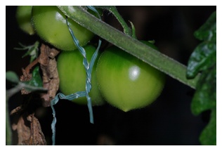 同じく種から育成中のトマトの実。この形は大型福寿トマトかな~?。・・・って、ホント不甲斐ない栽培者でごめんなさいとしか言いようがないですよ・・・。お家に来ばっかりに、こんな苦労してね~・・・^^;。