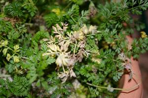 これまた見難くってゴメンナサイですけど、"ミニにんじん"の実ですが、こっちもヒョロヒョロ・・・。 |