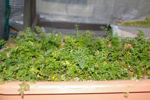 "ミニにんじん"の方はね、葉っぱがまだグタ~って寝たまんま起き上がってこないですね・・・。ま~あれだけ重い物や、 ひゅうが土がたくさんかかっちゃった訳ですからしょうがないけど、なんとか頑張ってホシイです。
