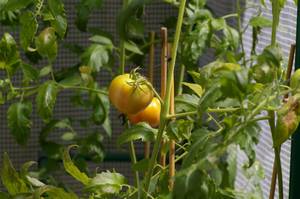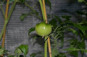 この写真じゃちょっと見えませんね~、ゴメンナサイ。"トマト"の実の隣に、また小さな実が出来始めてます。 |