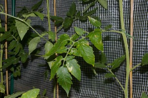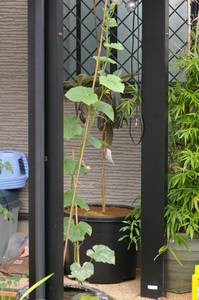 昨日、疑問が沸いてきたって書きました"キュウリ"の仕立て方なんですけど、ネットや本なんかで見てみると、主枝は2mくらいで摘芯、子づる?をある程度伸ばして摘芯って感じな記述が多いんだけど、お家の"キュウリ"は今の所この子づるって言うのが出てきてないんだよね、"キュウリ"の種類によって違うのかな~?。あんまり時間がなく、詳しくは調べ切れてないので、もうちょっと調べてみます。