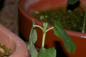 プランターの"丸オクラ"の様子です、2枚目の本葉?が大きく開いてきました^^。 |