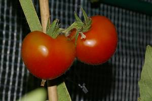 "ホーム桃太郎"の実です。写真で見ると真っ赤にみえますけど、実際はもうちょっと薄く、どちらかと言うとピンクっぽいです。 |