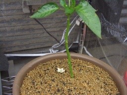 ラックの中のピーマンです、ちょっと調子悪いかな~、もしかして苗として最初から有る葉っぱとか花はダメで、新しく出てくる葉が成長していくのかも知れないですね。(勝手な想像ですが・・・) |