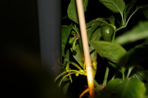 暗いところだと良くわかんなかったけど、やっぱり庭先と温室内で"ピーマン"の葉の色が違いますね。庭先の方は濃く温室内は薄く、はっきりと違いが分かります。だから何って事も無いんだけど、同じ苗なのにこうも違うのが不思議な感じがしたもので^^。