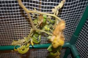 ちょっと見難くってゴメンナサイですけど・・・、"トマト"の茎の部分にヒビが・・・。一応伸ばして紐で支えておきましたけど・・・、もうココまでかな~・・・。せっかくイイ感じで膨らんできてくれたのに~・・・。 |