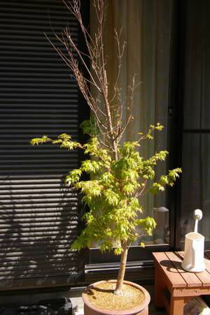 鉢植えのモミジです。下半分は絶好調なんだけどね・・・。 |